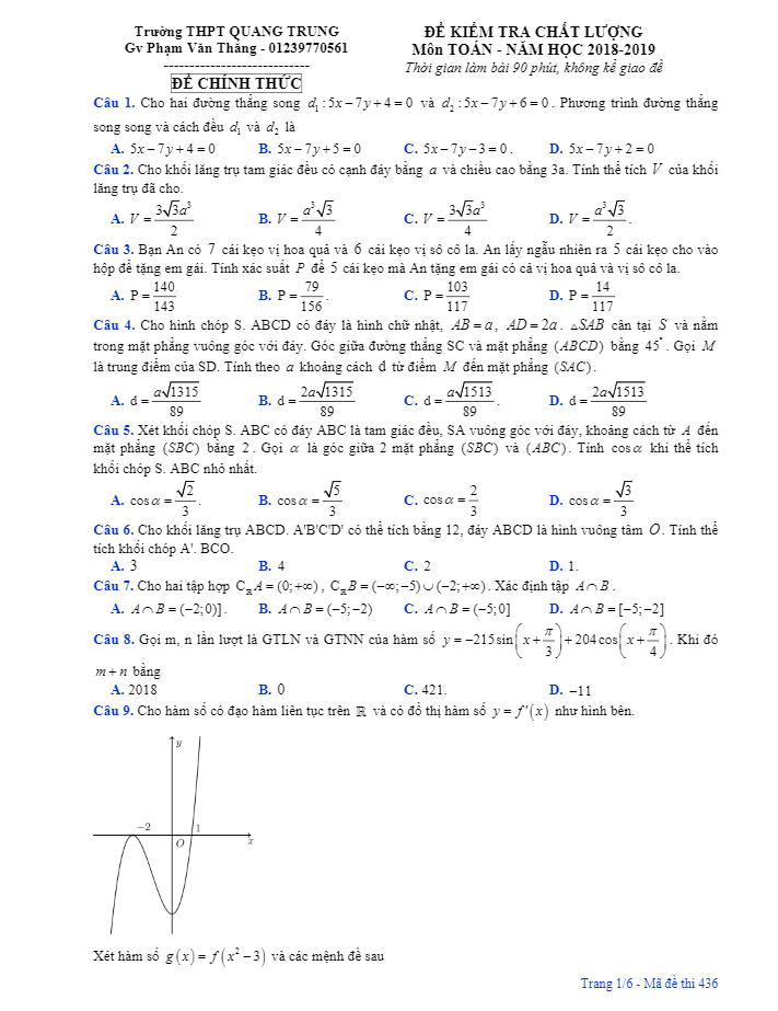 Đề kiểm tra chất lượng Toán 12 năm học 2018 – 2019 trường THPT Quang Trung – Hải Phòng