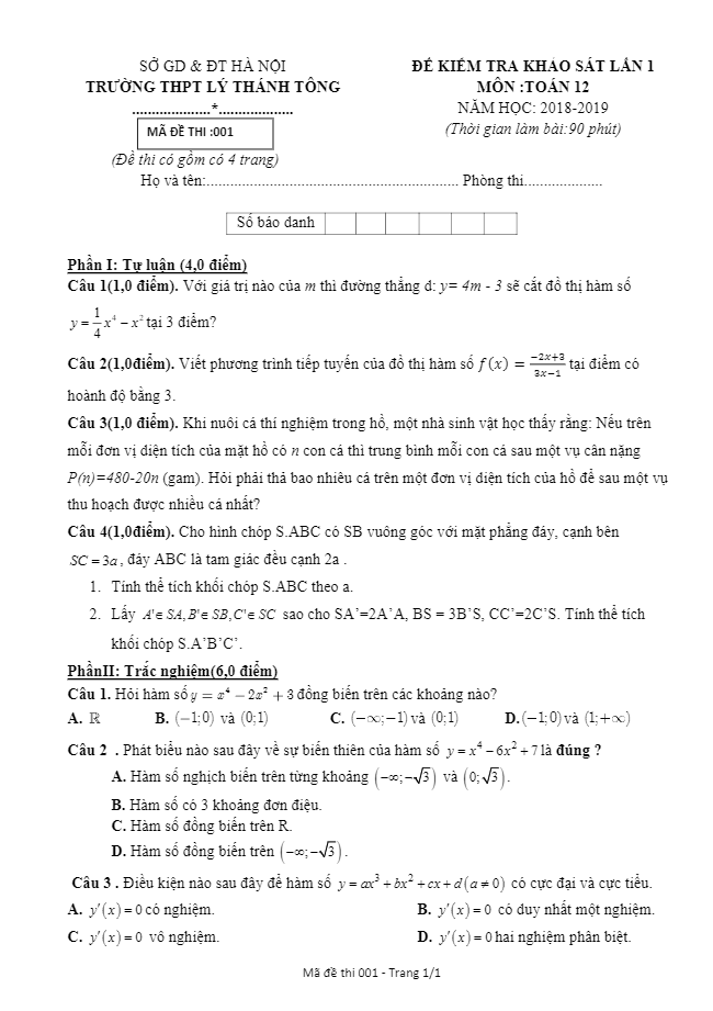 Đề kiểm tra khảo sát Toán 12 năm 2018 – 2019 trường THPT Lý Thánh Tông – Hà Nội lần 1
