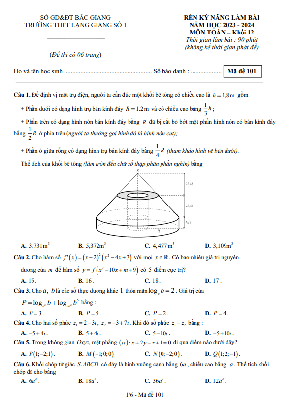 Đề rèn kỹ năng làm bài Toán 12 năm 2023 – 2024 trường THPT Lạng Giang 1 – Bắc Giang