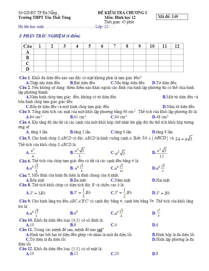 Đề kiểm tra 1 tiết chương 1 Hình học 12 (Khối đa diện) trường THPT Tôn Thất Tùng – Đà Nẵng