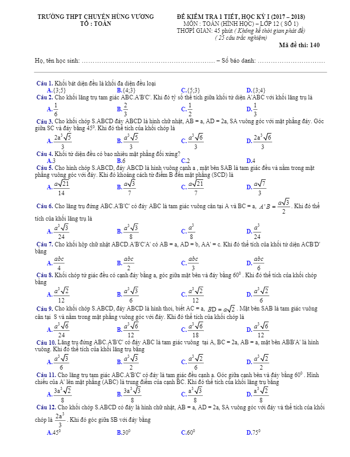 Đề kiểm tra 1 tiết Hình học 12 chương 1 (Khối đa diện) trường chuyên Hùng Vương – Gia Lai