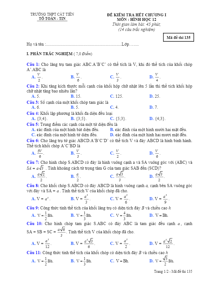 Đề kiểm tra chương 1 Hình học 12 trường THPT Cát Tiên – Lâm Đồng