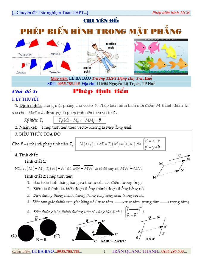 Tuyển tập các tài liệu môn Toán hay nhất về chủ đề PHÉP BIẾN HÌNH TRONG MẶT PHẲNG trong chương trình môn Toán lớp 11, bao gồm các nội dung: Phép Biến Hình Và Phép Dời Hình; Phép Tịnh Tiến; Phép Đối Xứng Trục; Phép Đối Xứng Tâm; Phép Quay; Phép Vị Tự; Phép Đồng Dạng.