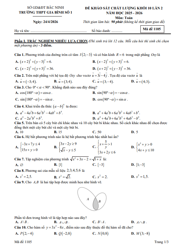• Đề khảo sát Toán 10 tháng 4 năm 2026 trường THPT Gia Bình 1 – Bắc Ninh