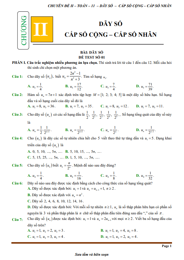 Đề kiểm tra theo bài học chủ đề dãy số, cấp số cộng và cấp số nhân