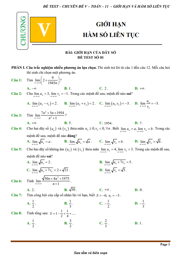 Đề kiểm tra theo bài học chủ đề giới hạn, hàm số liên tục