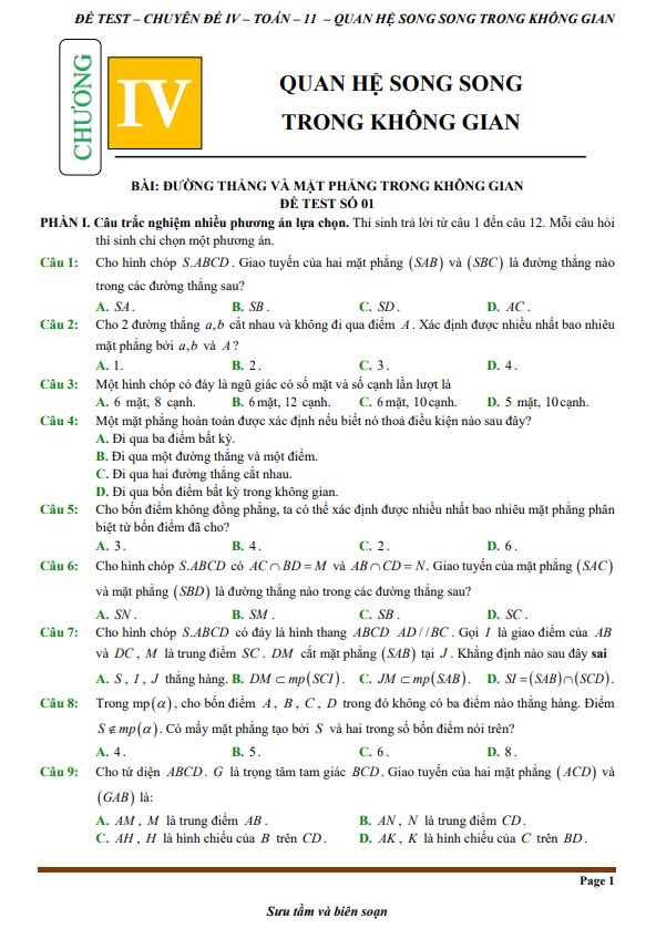 Đề kiểm tra theo bài học chủ đề quan hệ song song trong không gian