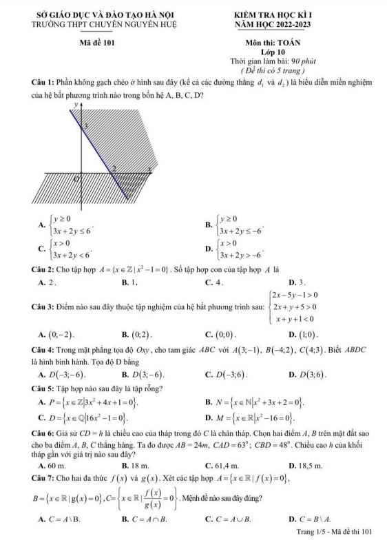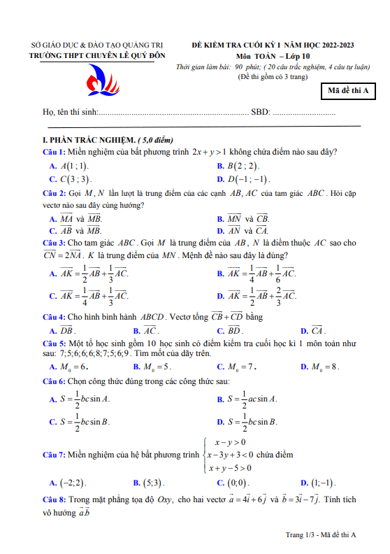 Đề Thi HK1 Toán 10 Đề cuối kì 1 Toán 10 năm 2022 – 2023 trường chuyên Lê Quý Đôn – Quảng Trị 13/01/2023
