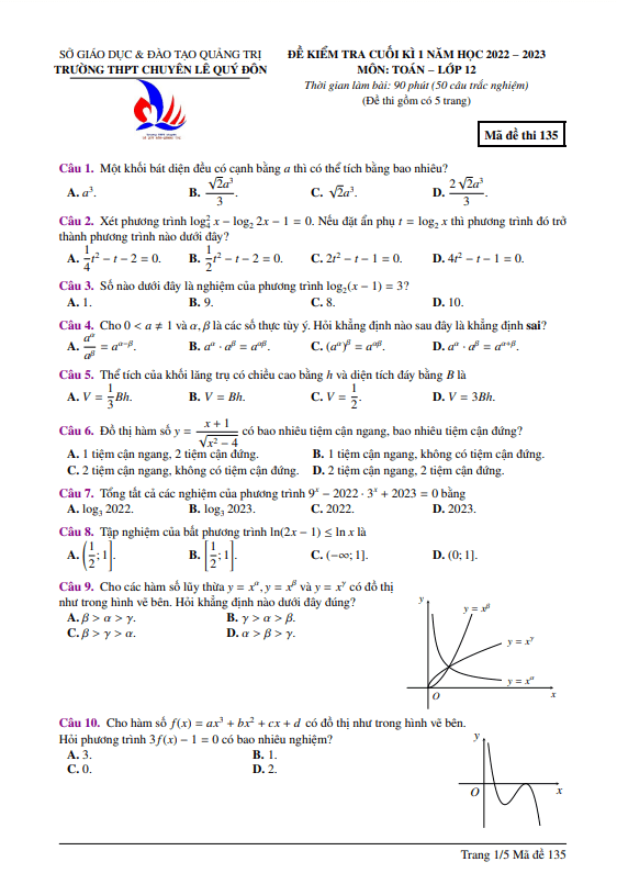 Đề Thi HK1 Toán 12 Đề cuối kì 1 Toán 12 năm 2022 – 2023 trường chuyên Lê Quý Đôn – Quảng Trị 13/01/2023