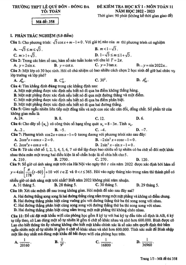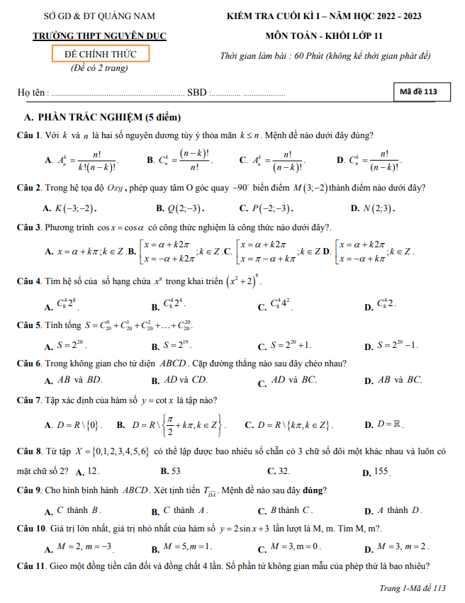 Đề Thi HK1 Toán 11 Đề cuối học kì 1 Toán 11 năm 2022 – 2023 trường THPT Nguyễn Dục – Quảng Nam 04/01/2023