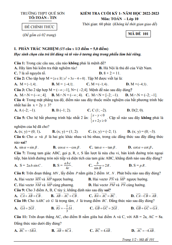 Đề Thi HK1 Toán 10 Đề cuối học kỳ 1 Toán 10 năm 2022 – 2023 trường THPT Quế Sơn – Quảng Nam 04/01/2023