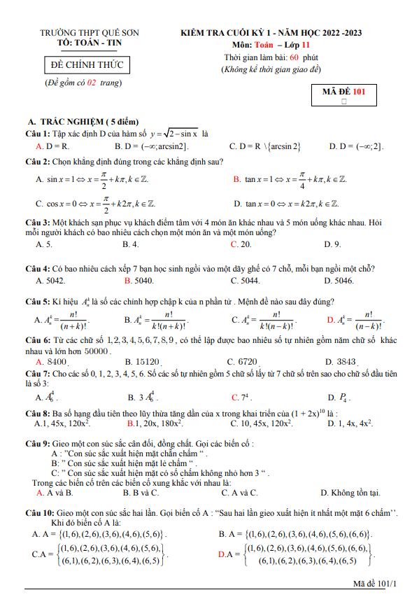 Đề Thi HK1 Toán 11 Đề cuối học kỳ 1 Toán 11 năm 2022 – 2023 trường THPT Quế Sơn – Quảng Nam 04/01/2023