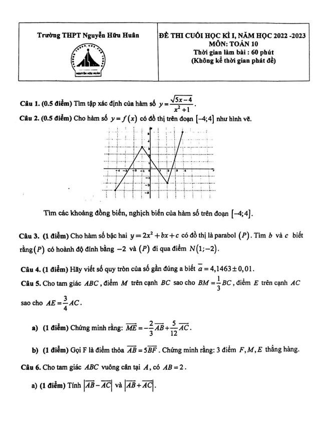 Đề Thi HK1 Toán 10 Đề cuối kì 1 Toán 10 năm 2022 – 2023 trường THPT Nguyễn Hữu Huân – TP HCM 03/01/2023