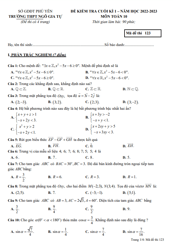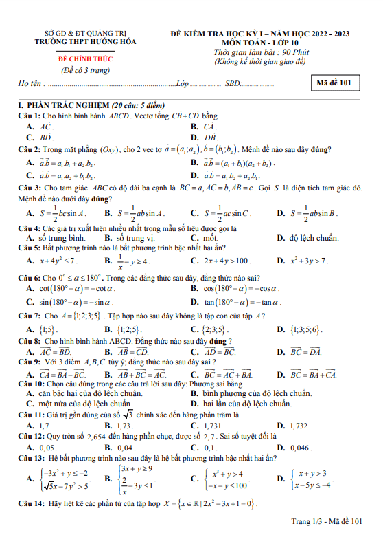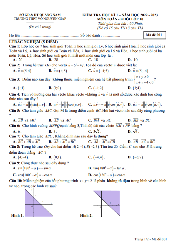 Đề Thi HK1 Toán 10 Đề thi HK1 Toán 10 năm 2022 – 2023 trường THPT Võ Nguyên Giáp – Quảng Nam 04/01/2023