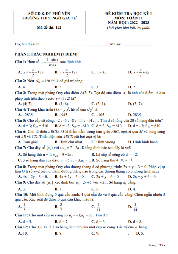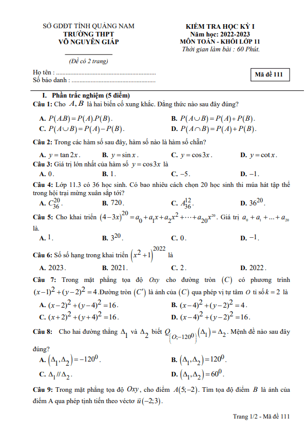 Đề Thi HK1 Toán 11 Đề thi HK1 Toán 11 năm 2022 – 2023 trường THPT Võ Nguyên Giáp – Quảng Nam 04/01/2023