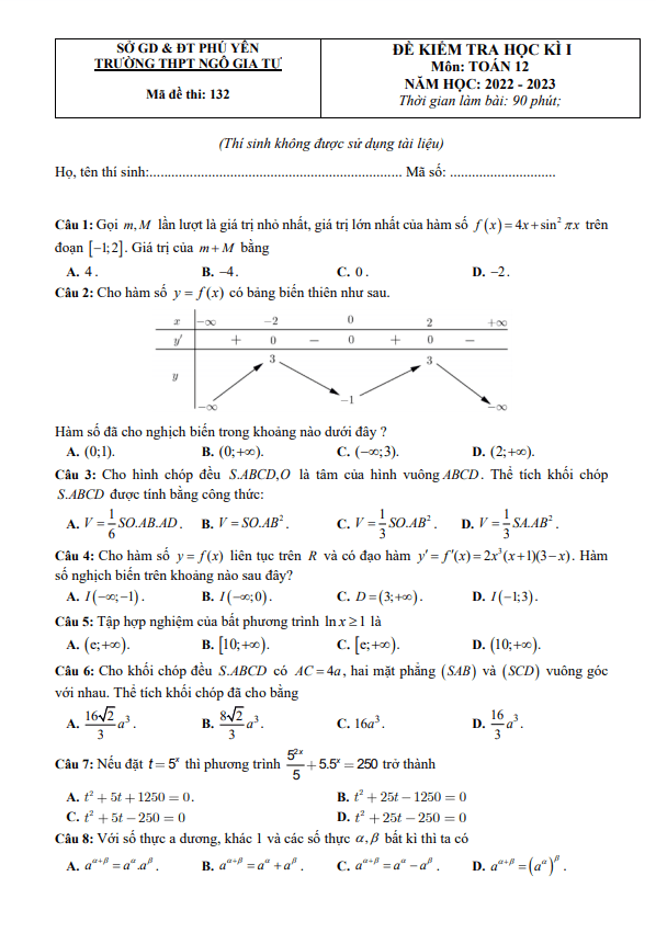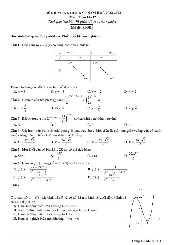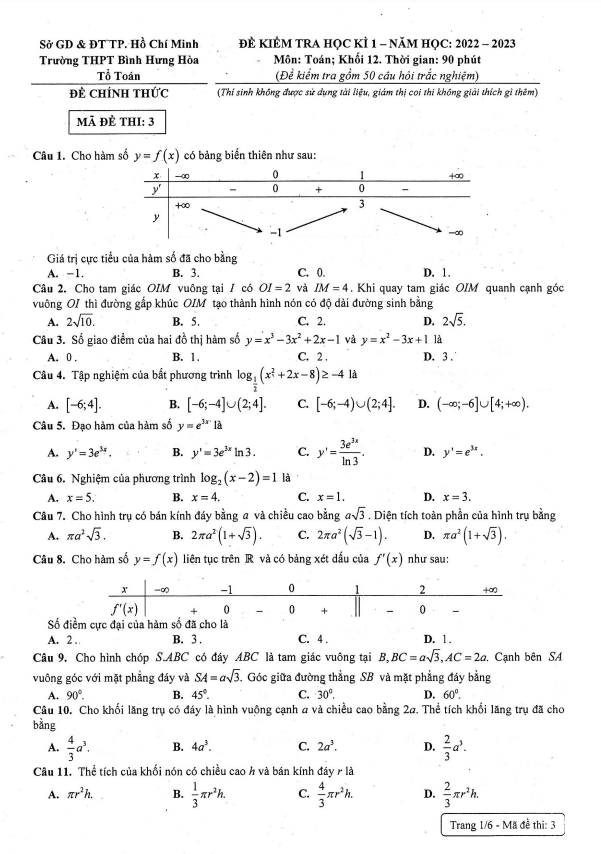 Đề Thi HK1 Toán 12 Đề học kỳ 1 Toán 12 năm 2022 – 2023 trường Nguyễn Thị Minh Khai – Hà Nội 03/01/2023