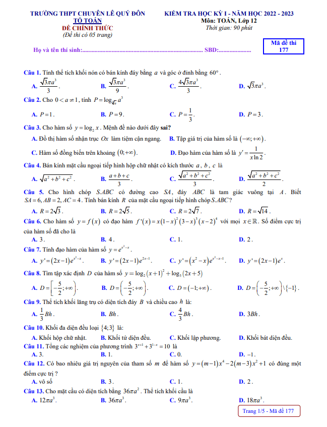 Đề Thi HK1 Toán 12 Đề học kỳ 1 Toán 12 năm 2022 – 2023 trường THPT chuyên Lê Quý Đôn – BR VT 03/01/2023