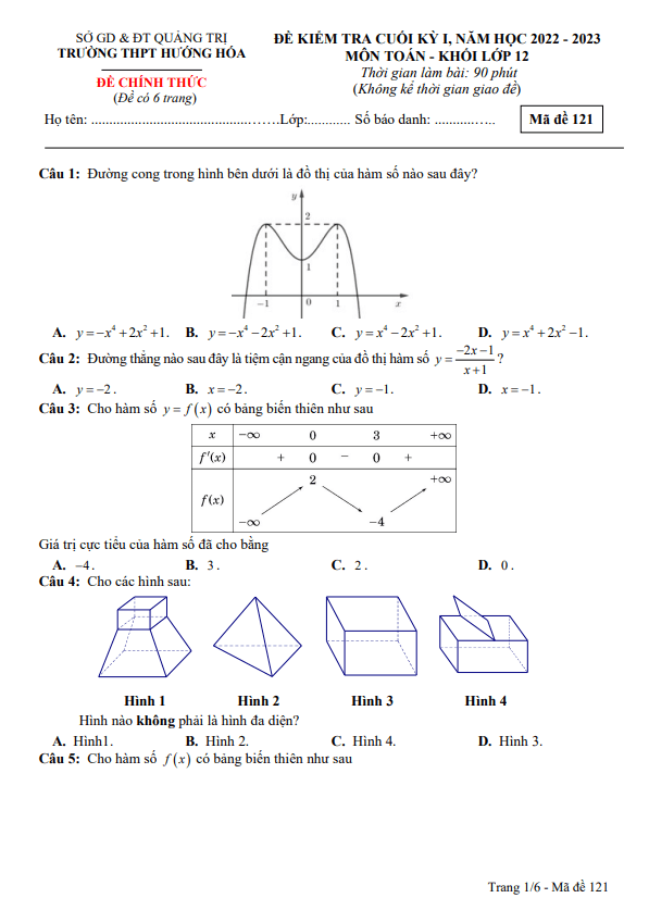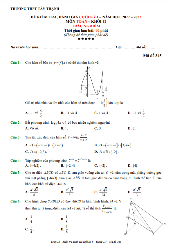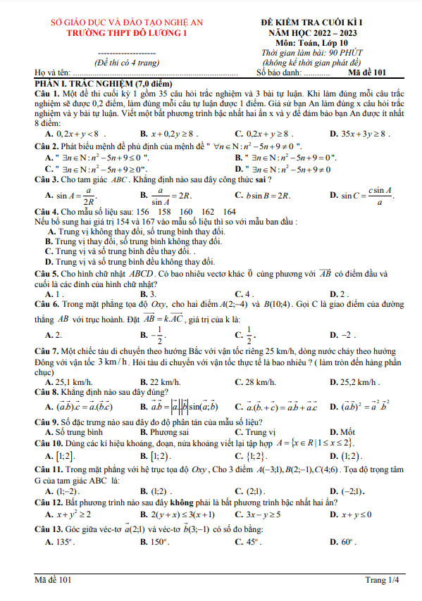 Đề Thi HK1 Toán 10 Đề cuối kì 1 Toán 10 năm 2022 – 2023 trường chuyên Nguyễn Tất Thành – Yên Bái 01/01/2023