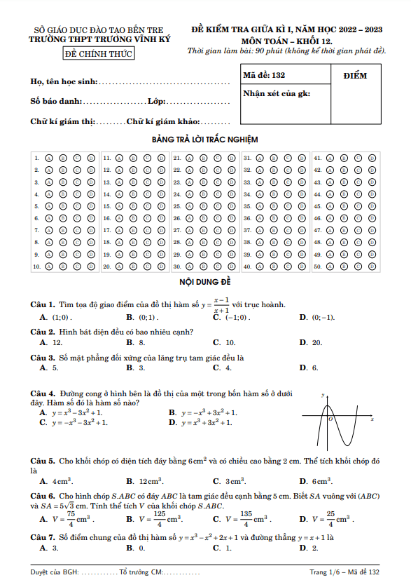 Đề Thi Giữa HK1 Toán 12 Đề giữa kì 1 Toán 12 năm 2022 – 2023 trường THPT Trương Vĩnh Ký – Bến Tre 15/11/2022