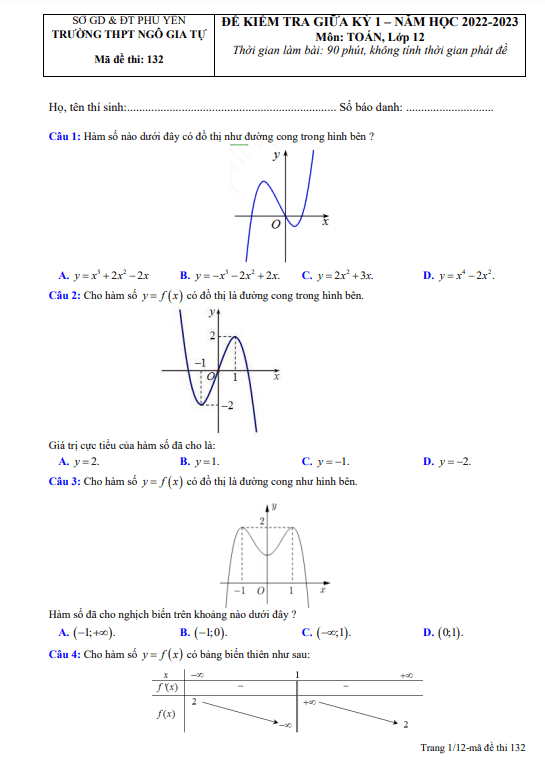 Đề Thi Giữa HK1 Toán 12 Đề giữa kỳ 1 Toán 12 năm 2022 – 2023 trường THPT Ngô Gia Tự – Phú Yên 16/11/2022