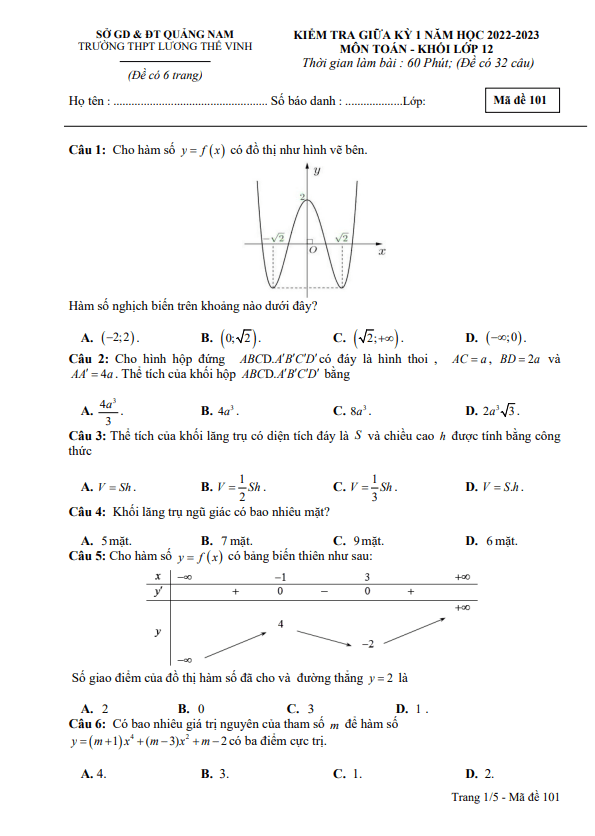 Đề Thi Giữa HK1 Toán 12 Đề giữa học kỳ 1 Toán 12 năm 2022 – 2023 trường THPT Lương Thế Vinh – Quảng Nam 12/11/2022