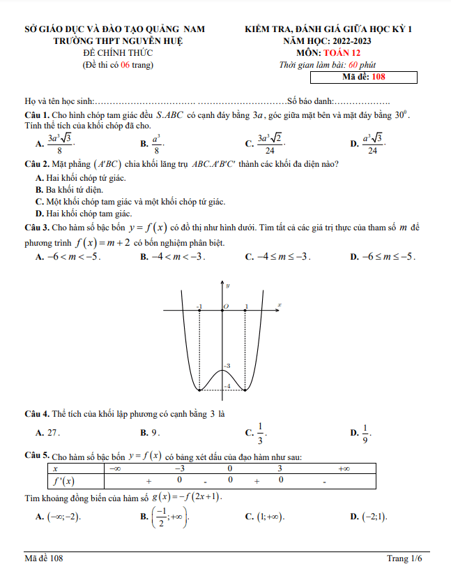 Đề Thi Giữa HK1 Toán 12 Đề giữa học kỳ 1 Toán 12 năm 2022 – 2023 trường THPT Nguyễn Huệ – Quảng Nam 12/11/2022