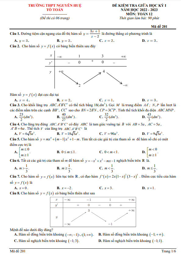 Đề Thi Giữa HK1 Toán 12 Đề giữa kỳ 1 Toán 12 năm 2022 – 2023 trường THPT Nguyễn Huệ – Phú Yên 12/11/2022