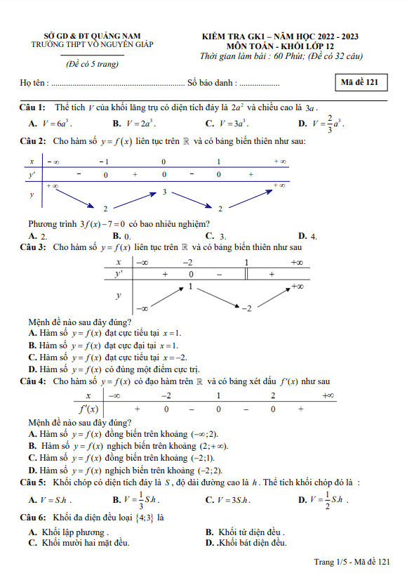 Đề Thi Giữa HK1 Toán 12 Đề kiểm tra GK1 Toán 12 năm 2022 – 2023 trường THPT Võ Nguyên Giáp – Quảng Nam 12/11/2022