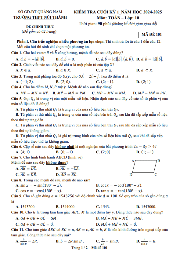 Đề Thi HK1 Toán 10 Đề cuối kì 1 Toán 10 năm 2024 – 2025 trường THPT Triệu Sơn 4 – Thanh Hóa 03/01/2025